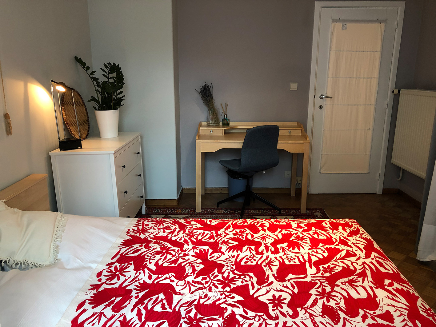 The bedroom is 16 square meter, fully-furnished: queen size bed, drawer-chest, wardrobe, desk, and your private sink.